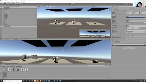 The final scene, as mentioned above, took form when designing for the first iteration of the final prototype, in which we built a scene with 3 sets of objects that react differently with gaze, and having the overall gravity controlled by the user’s attention level. I started by making three groups of objects that react to gravity when being gazed at, react to gravity when not being gazed at, and receive an upward force when being gazed at, respectively. The first two sets of objects worked as intended, and created some interesting interactions when combined together. The third set turned out to be more about gaze than about attention level, and didn’t provide enough feedback on what the current attention level was. Both the changing gravity level and the force applied were based on attention level, so they counteracted each other. In the next prototypes, these objects were being replaced by blocks that weren’t affected by gaze to provide an overall visualization of the current gravity level.